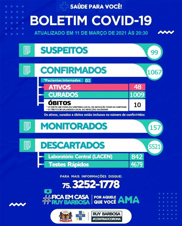 Confira o boletim da Covid-19 desta quinta-feira em Ruy Barbosa