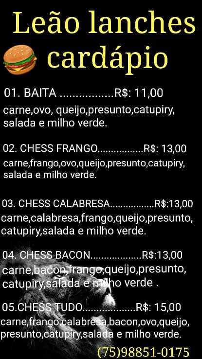 Chegou em Ruy Barbosa a Leão Lanches, nova opção em nossa cidade. Experimente ligando para o 75 98851-0175
