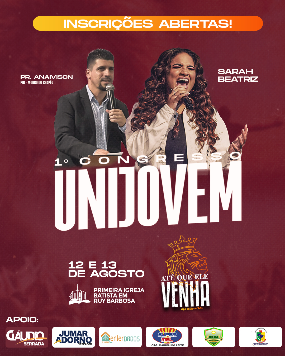 Nos dias 12 e 13 de agosto, vai acontecer o 1º Congresso da UNIJOVEM da Primeira Igreja Batista de Ruy Barbosa, com o tema : “ATÉ QUE ELE VENHA”. O Evento acontecerá na Primeira Igreja Batista.