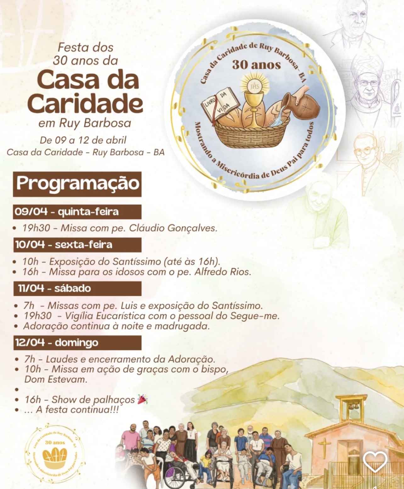 A Casa da Caridade de Ruy Barbosa (BA)completa três décadas de história e dedicação ao próximo. Para celebrar este marco significativo, foi anunciada uma programação especial que ocorrerá entre os dias 09 e 12 de abril, unindo momentos de fé, reflexão e alegria sob o lema: “Mostrando a Misericórdia de Deus Pai para todos".