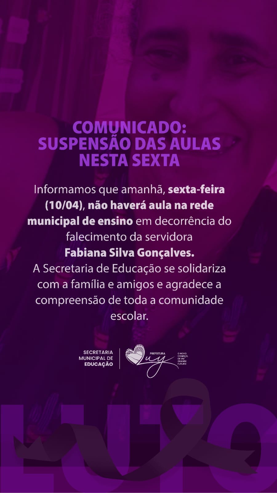 A Secretaria Municipal de Educação emitiu um comunicado informando a suspensão das aulas nessa sexta-feira (10). De acordo com a nota, não haverá aula na rede municipal de ensino devido o falecimento da servidora Fabiana Silva Gonçalves.